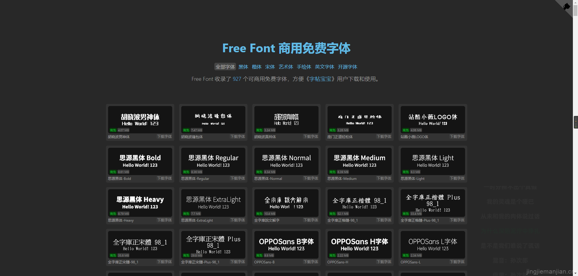 在查找可商用字体资源时,我发现了一个整理得比较集中的字体网站:Free Font 商用免费字体。它主要收录了可免费商用的中文和英文字体,适合个人项目或商业设计使用。
